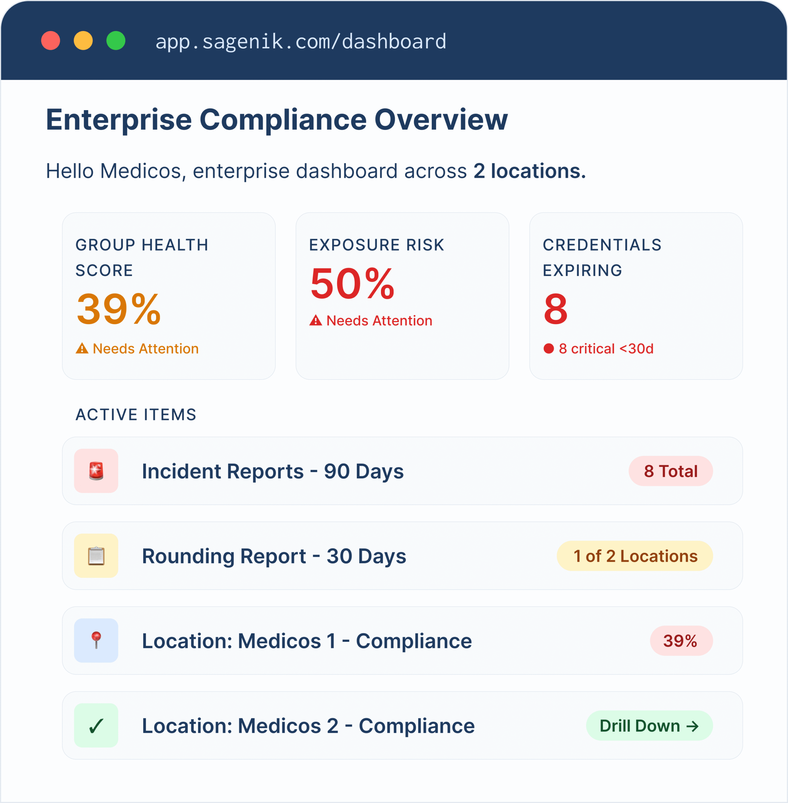 Most healthcare groups may have binders, training logs, and good intentions. What almost none of them have is proof — that a specific person, at a specific location, on a specific date, completed a specific obligation. Sagenik closes that gap. Every task assigned by name. Every completion logged with evidence. Every record exportable on demand.