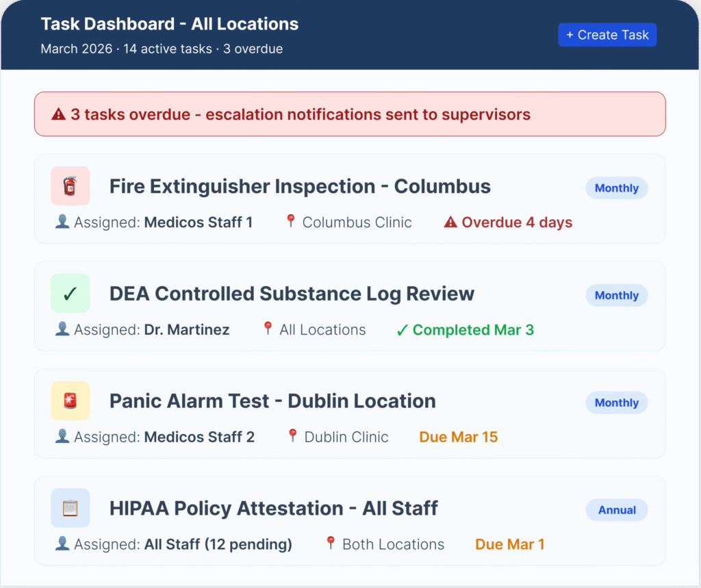 No other compliance platform we’re aware of combines custom task creation with named accountability and a full audit trail — for every compliance action across every location of a medical group.