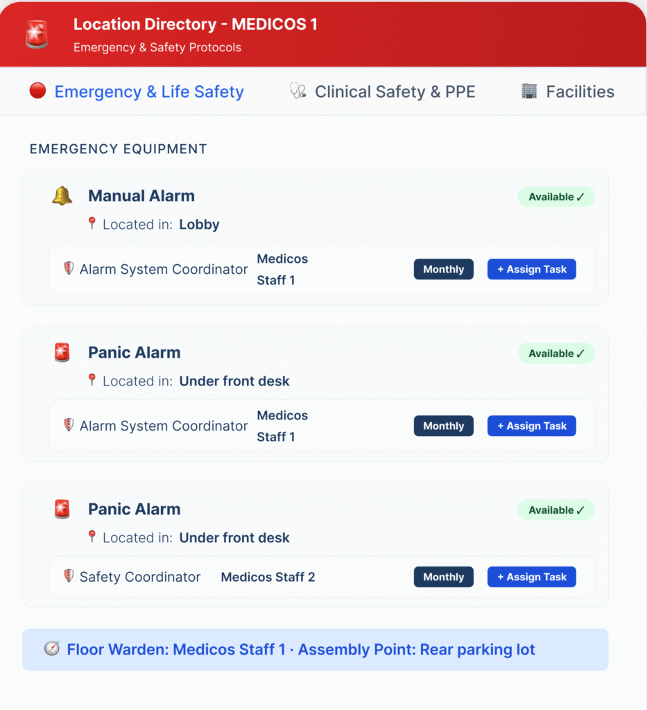 Every clinic has an emergency binder behind the front desk that nobody can find in a crisis. Sagenik replaces it with a living, location-specific emergency and safety reference — accessible to every staff member on any device, in real time. Where is the panic alarm? Who is the floor warden today? Where do we assemble?