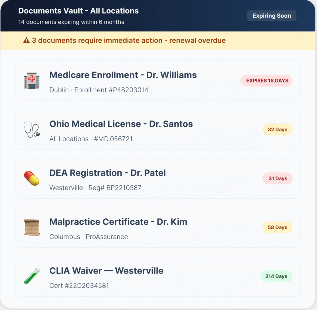- Track every document with an expiration date: medical licenses, DEA certificates, Medicare/Medicaid enrollment, malpractice coverage, CLIA waivers, board certifications, facility licenses.