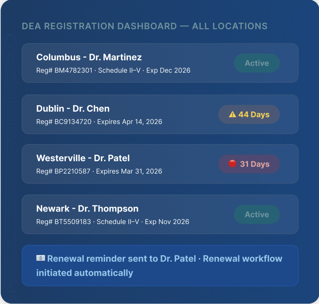 Every DEA registration must be tracked per-location, per-prescriber. Controlled substance logs, inventory schedules, discrepancy investigations — each carries separate violation risk. No major compliance platform touches DEA. That gap leaves multi-prescriber groups managing six-figure exposure in spreadsheets, from memory, across multiple locations. One missed entry. One uninvestigated discrepancy. One inspection.
